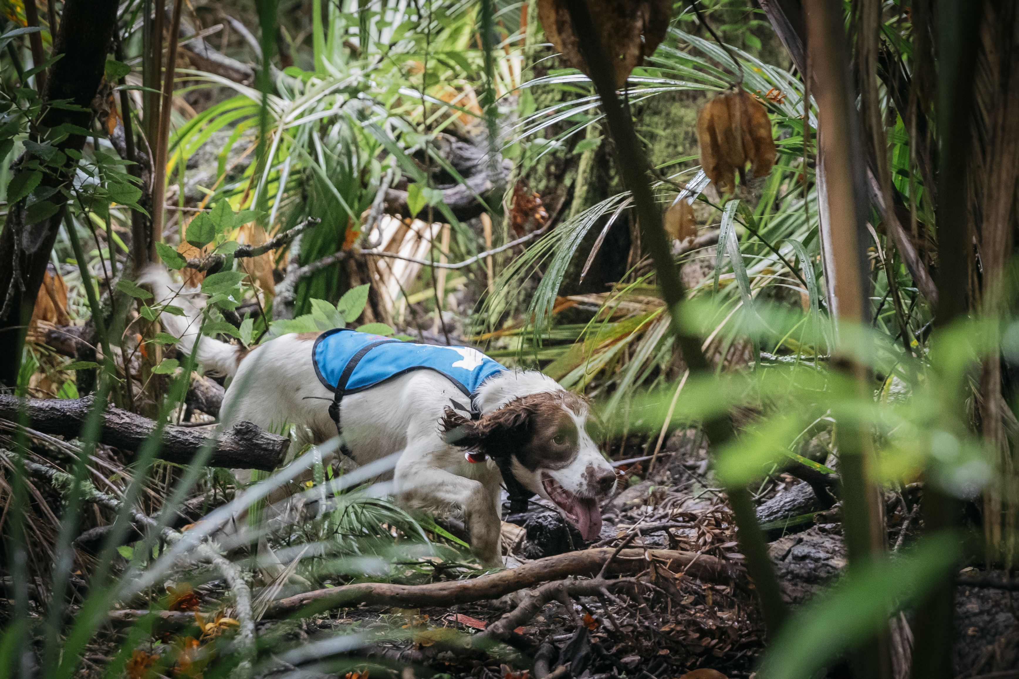 Figure 2: Qualmons Possum dog Beck (handler – Kiri Stack), in action, indicating on a possum up a pūriri tree. A trap is then set based on the positive detection